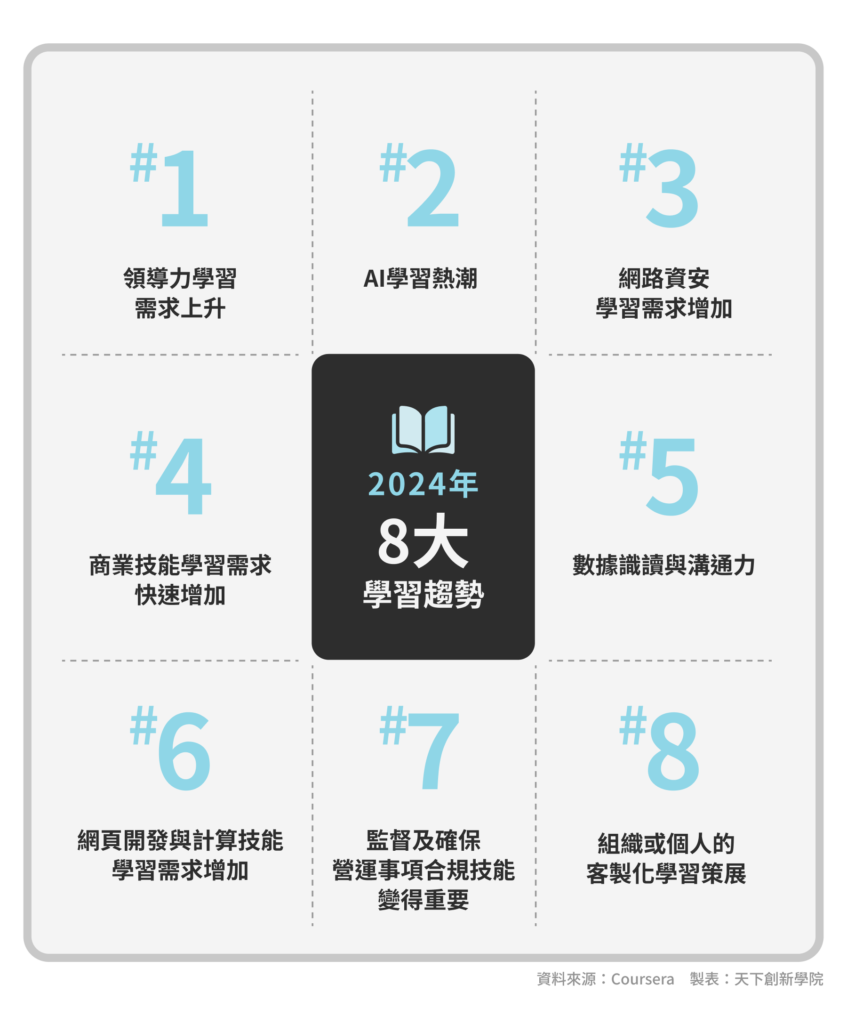 快速變化的大環境,想光靠學校教育或單一技能來保住飯碗,難度恐怕愈來愈高。面對變局,從經理人到專業工作者,都要有不斷學會新技能的能力。 無論個人或企業,想持續升級,2024年該學什麼?人才培育策略往哪個方向調整,才能與時俱進?全球熱門學習平台Coursera從平台數據中,提供8大學習趨勢洞察。